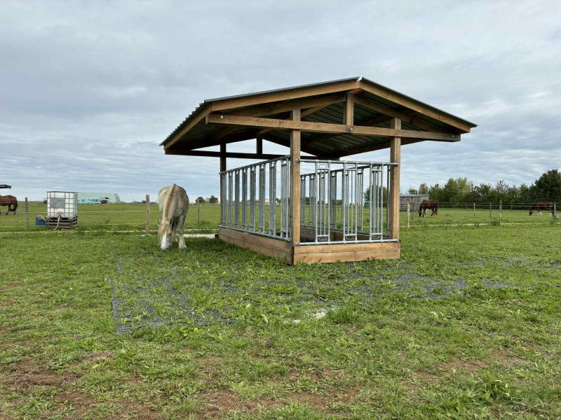 * Zone d'affouragement spécifique : foin avec filet à mailles pour les équidés trop ronds