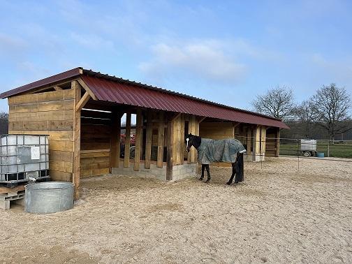 Pension Paddock stabilité/Cabane : Cabane avec deux box sur plaquette de bois et râtelier de foin à volonté ouvert sur plateforme stabilité, ouvert sur paddock en herbe. Paddock par pair. eau à disposition