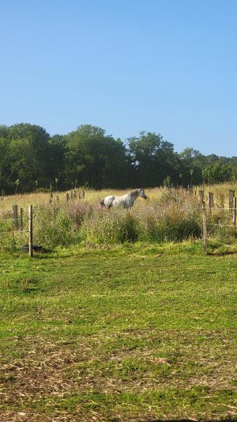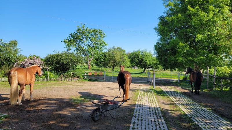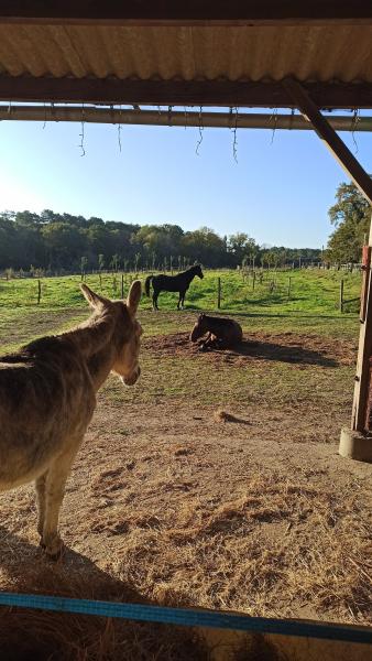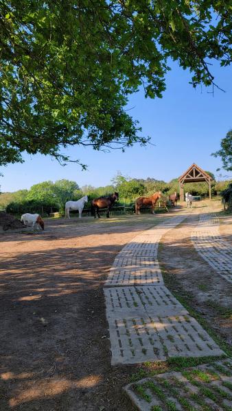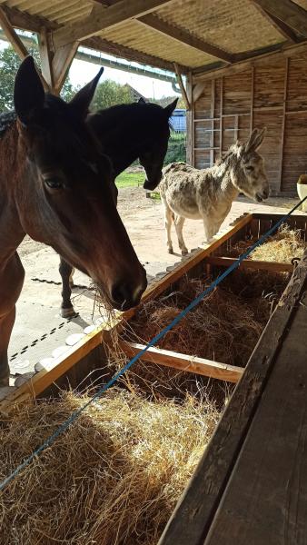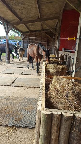 Hébergement en troupeaux, type Equi-Piste /Paddock-Paradise ; Foin à volonté toute l'année ; mise à l'herbe régulée et en pâturage tournant, Carrière et Manège ; Sellerie commune ; Parking.